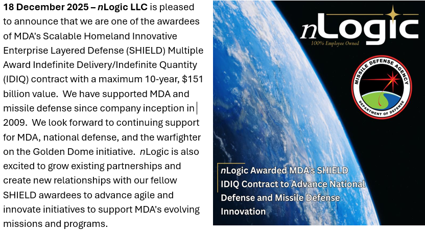 MDA SHIELD Awardee Leave a Comment / Uncategorized 18 December 2025 – nLogic Awardee on MDA’s Scalable Homeland Innovative Enterprise Layered Defense (SHIELD).